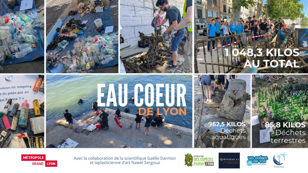 Odysseus 3.1, Un Océan de Vie, Des Espèces Parmi’Lyon et RANDOSSAGE ont mobilisé leur énergie pour cette action d’envergure en plein cœur de Lyon. Ce projet de sensibilisation à l’Eau Bien commun, s’est réalisée en collaboration avec Gaëlle Darmon, Scientifique indépendante et Nawel Sergoua Plasticienne d’Art.