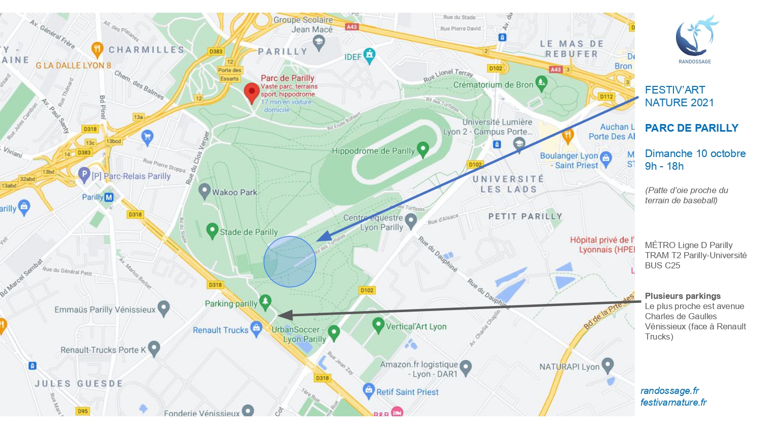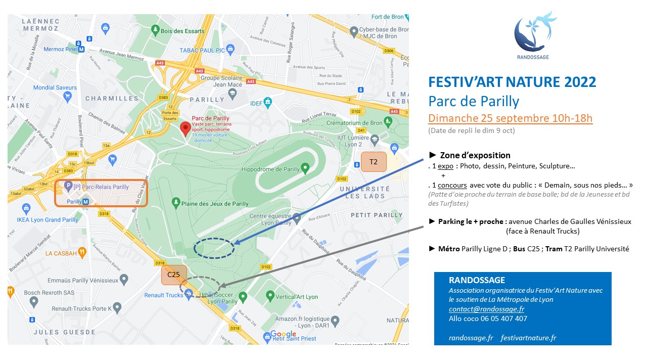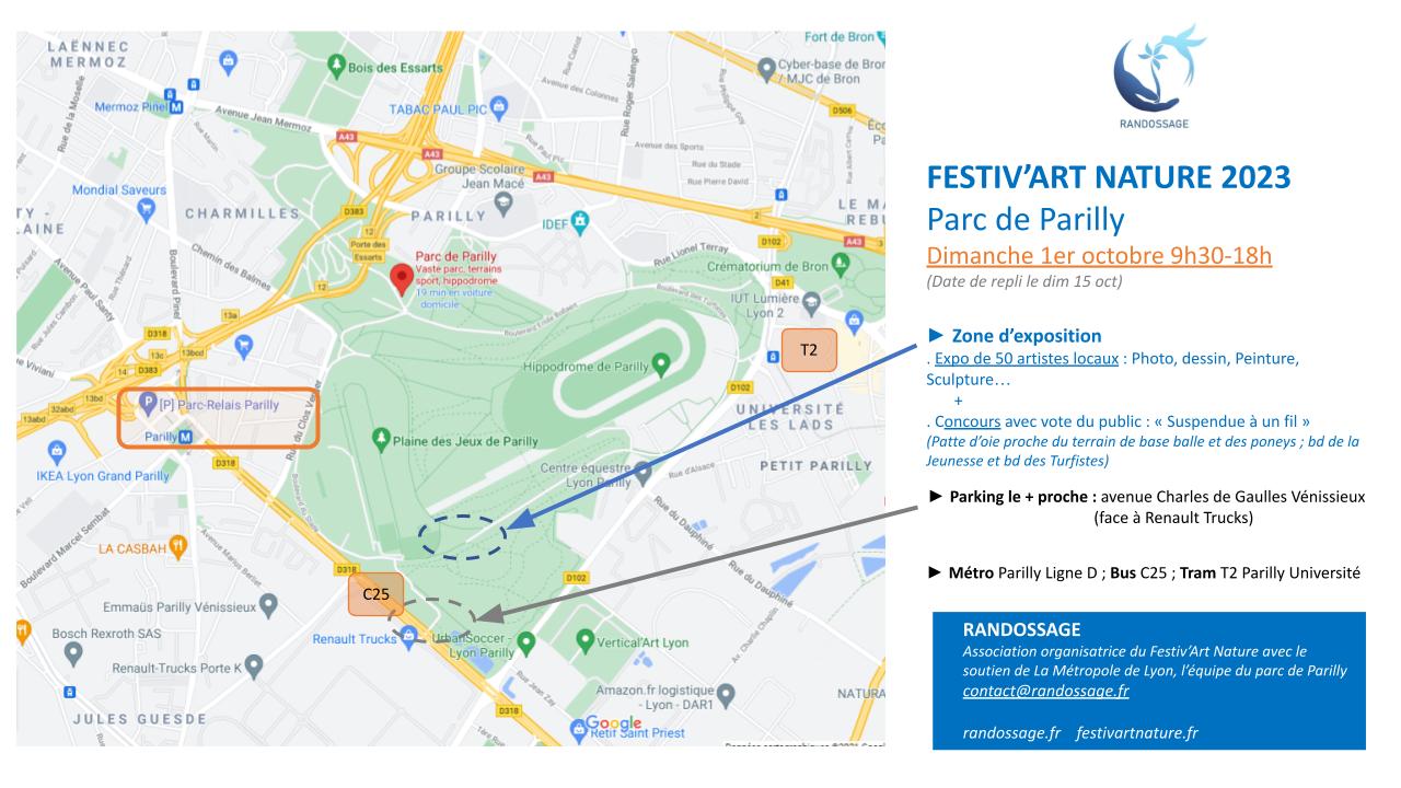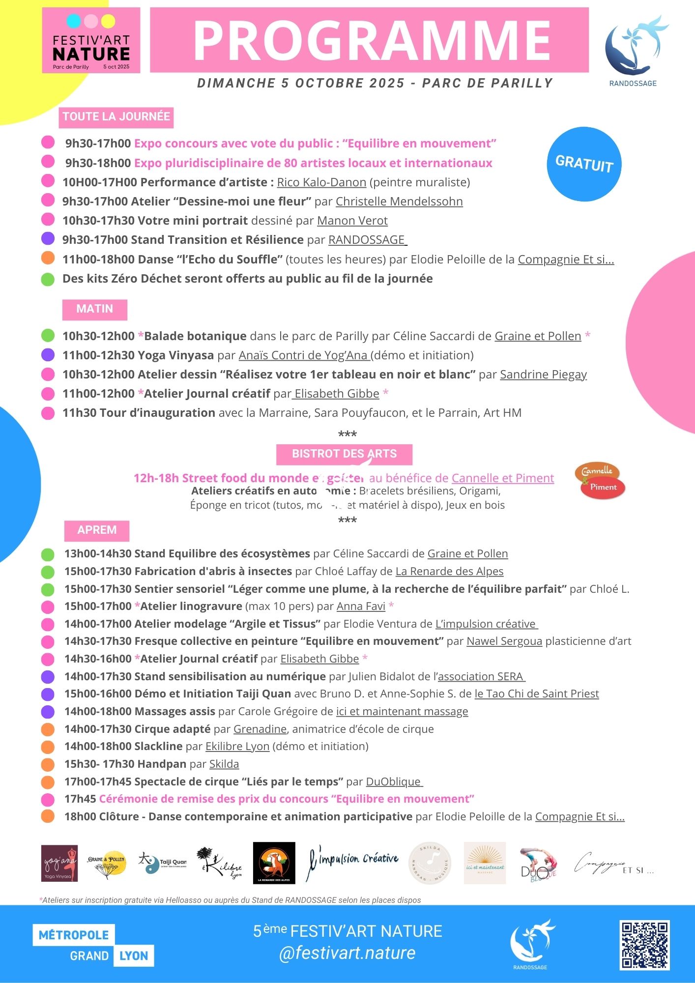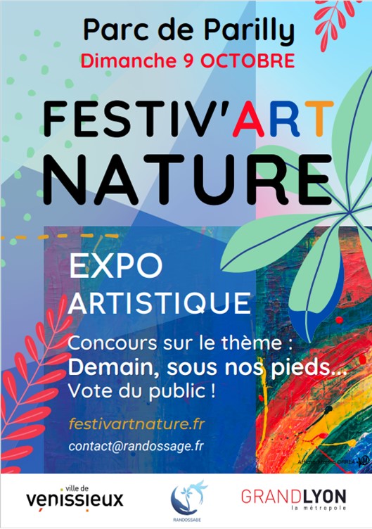 Depuis 2021, le Festiv’Art Nature est organisé par RANDOSSAGE soutenue par la Métropole de Lyon et l’équipe du Parc de Parilly dans le cadre du Paln d’Accompagnement à la Transition et la Résilience.